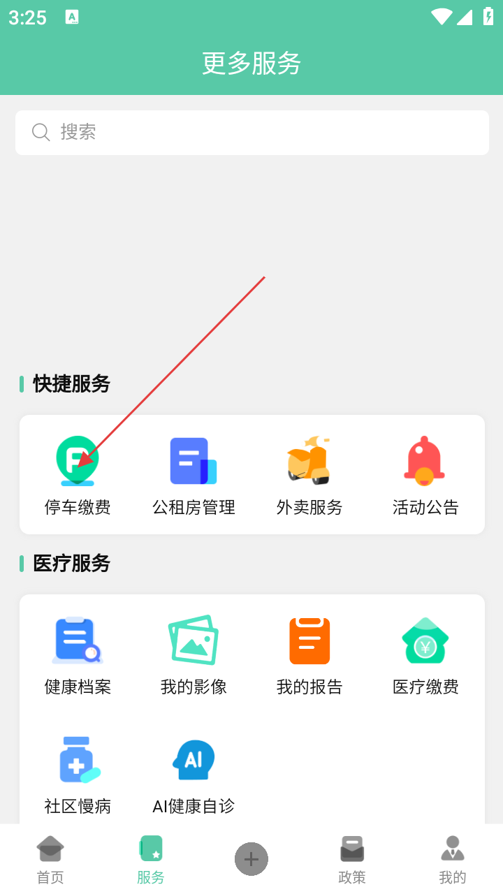 2、进入【更多服务】页,可使用【停车缴费】功能快速管理车辆相关事务。