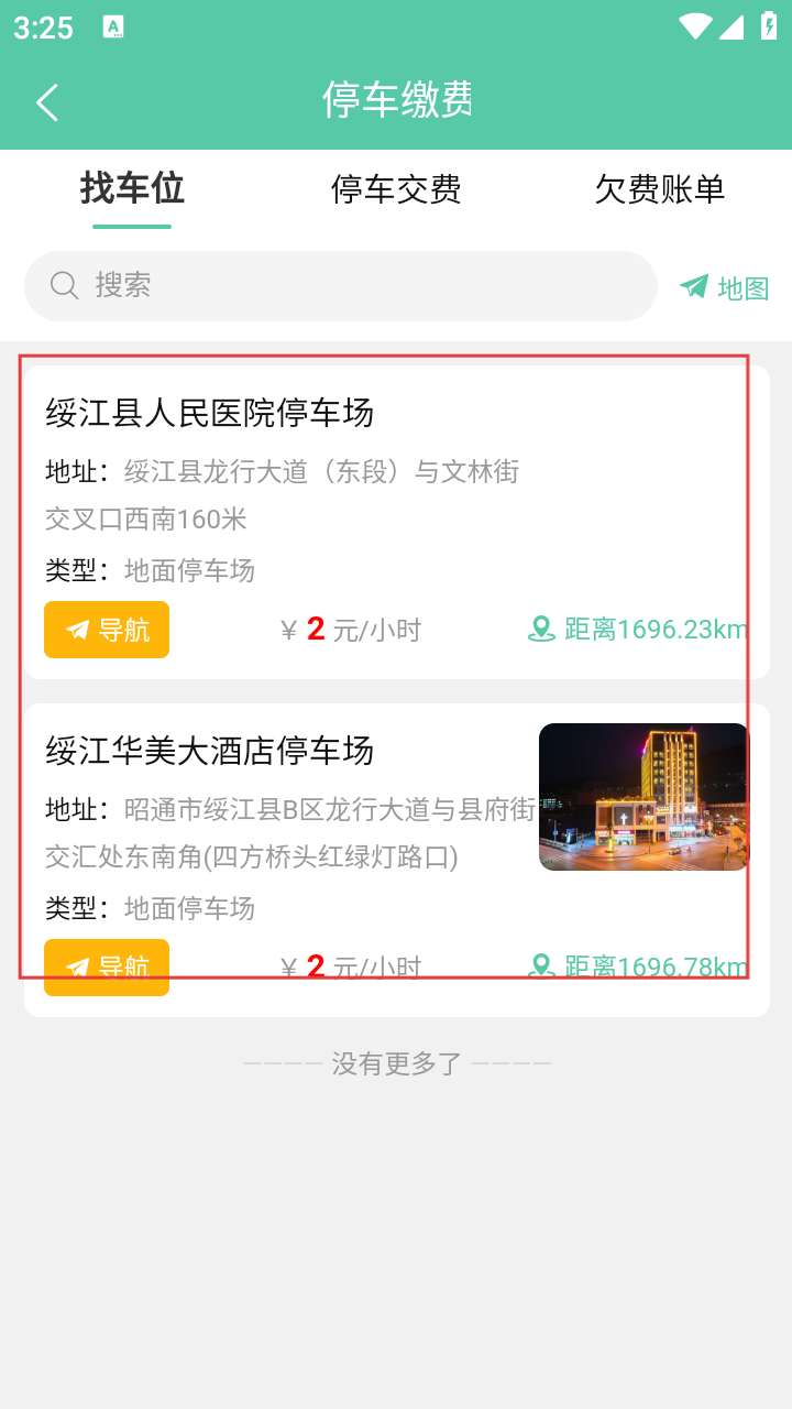 3、在【停车缴费】界面选择【找车位】,查看附近停车场信息如【绥江县人民医院停车场】并点击【导航】。