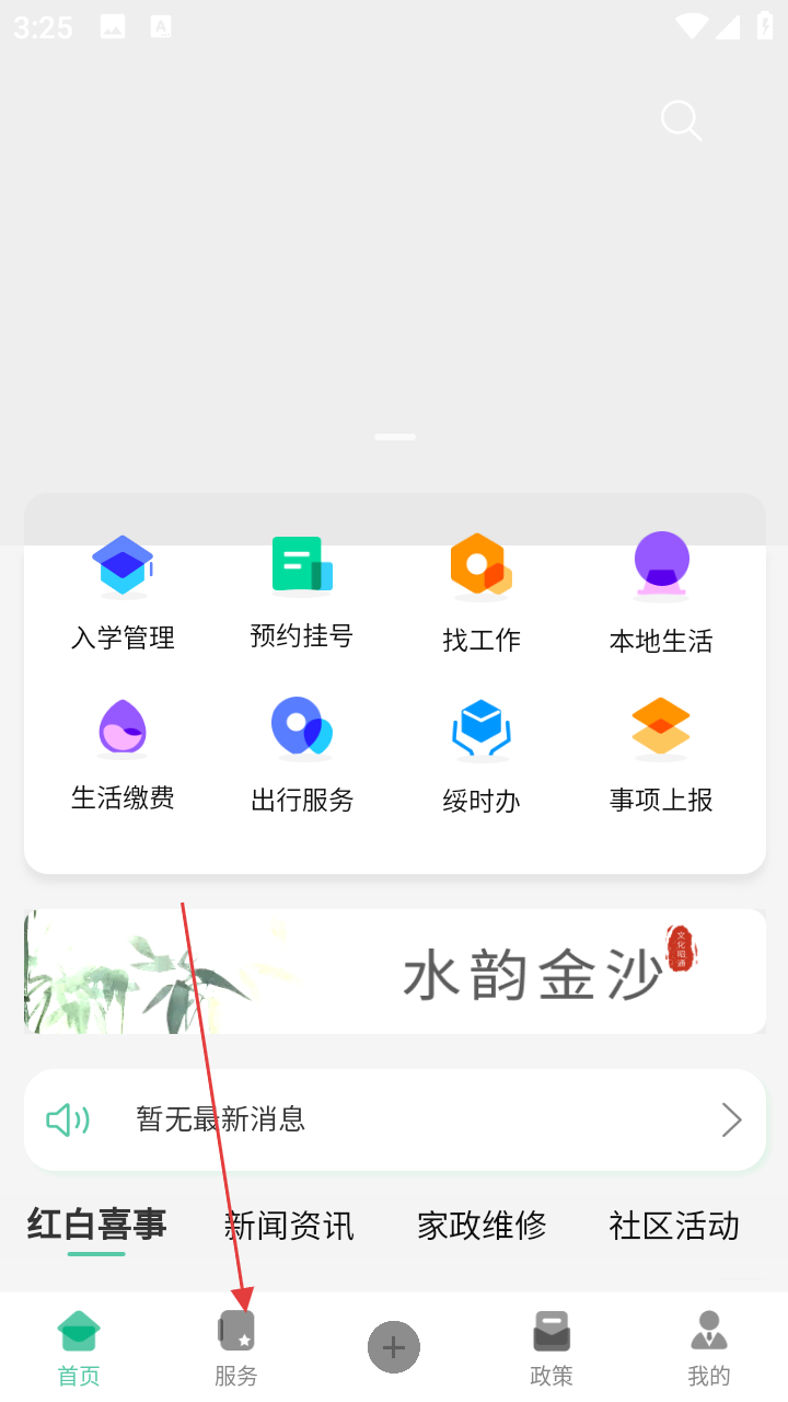 1、进入应用后先浏览【首页】功能区,熟悉【入学管理】【预约挂号】等核心服务入口布局,点击底部导航栏【服务】。