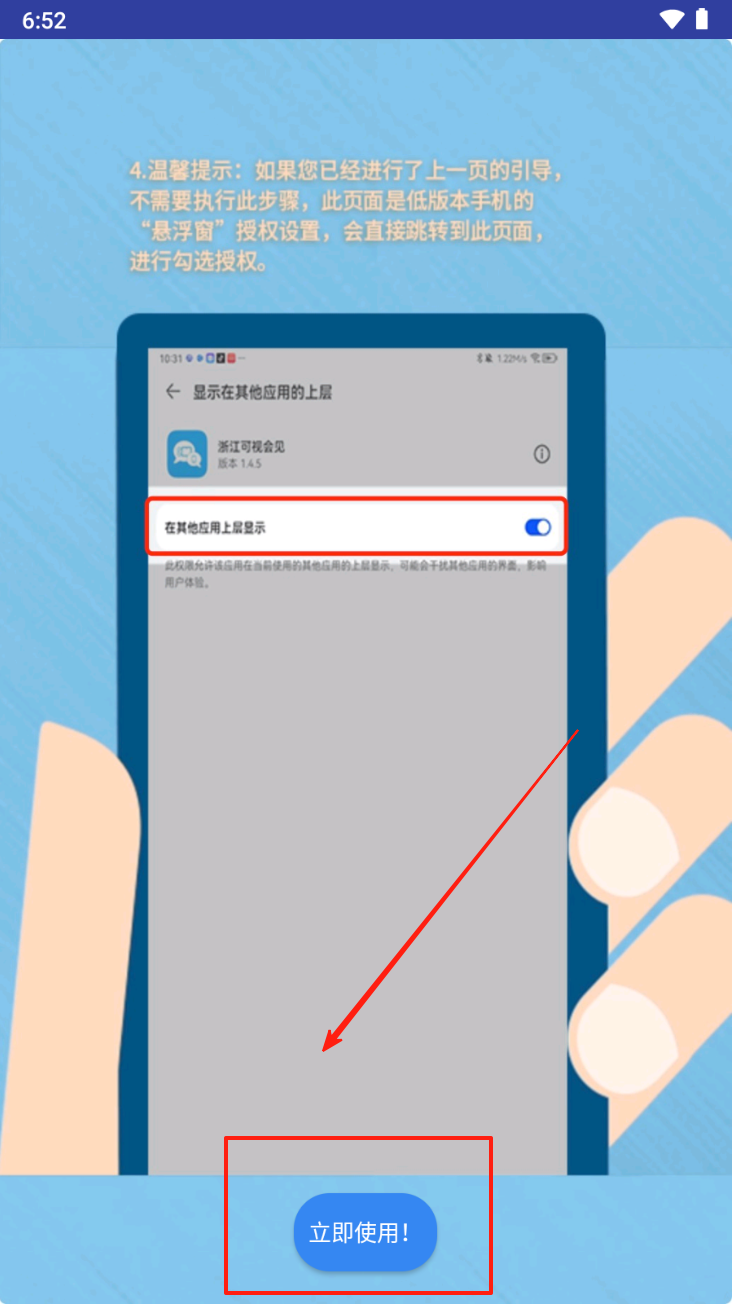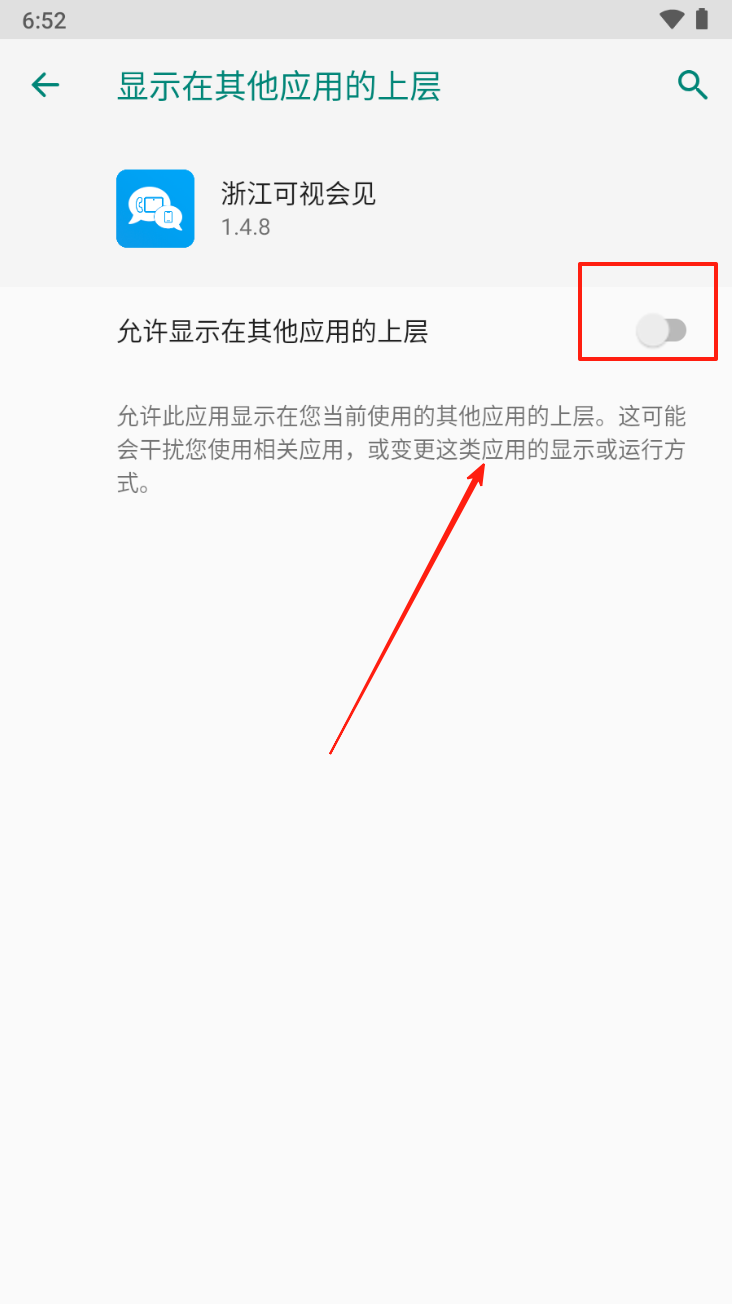 1、在权限设置页面,打开“在其他应用上层显示”开关,允许应用在其他应用上层显示。