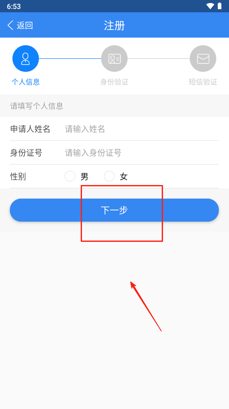 4、在注册页面,填写个人信息,点击“下一步”按钮,完成注册流程。