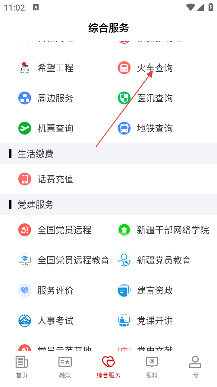 2、在综合服务页,找到【火车查询】选项并点击,跳转至火车查询界面。