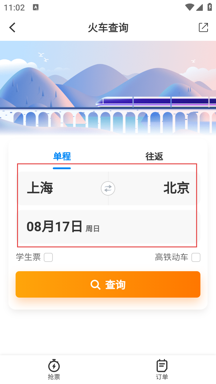 3、在火车查询页,选择行程类型,填写出发地、目的地、日期,点击【查询】。