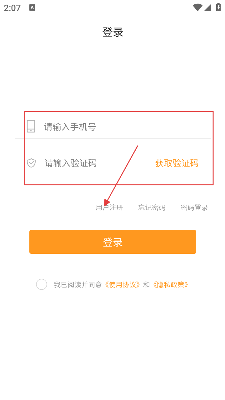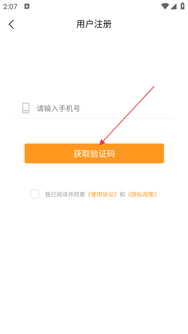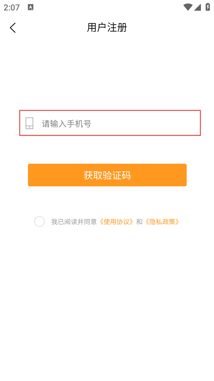 3、在用户注册页面,输入手机号,勾选“我已阅读并同意《使用协议》和《隐私政策》”。