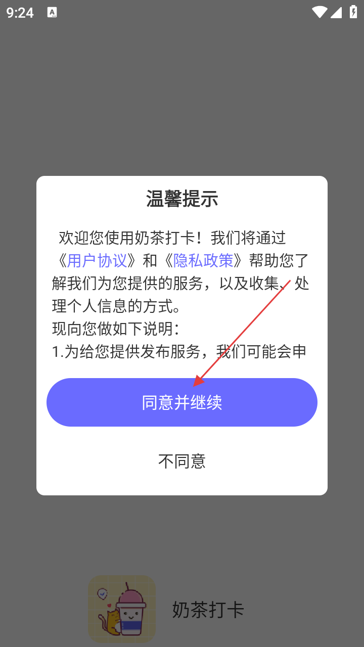 1、首次打开应用,查看温馨提示弹窗点击【同意并继续】,接受协议。