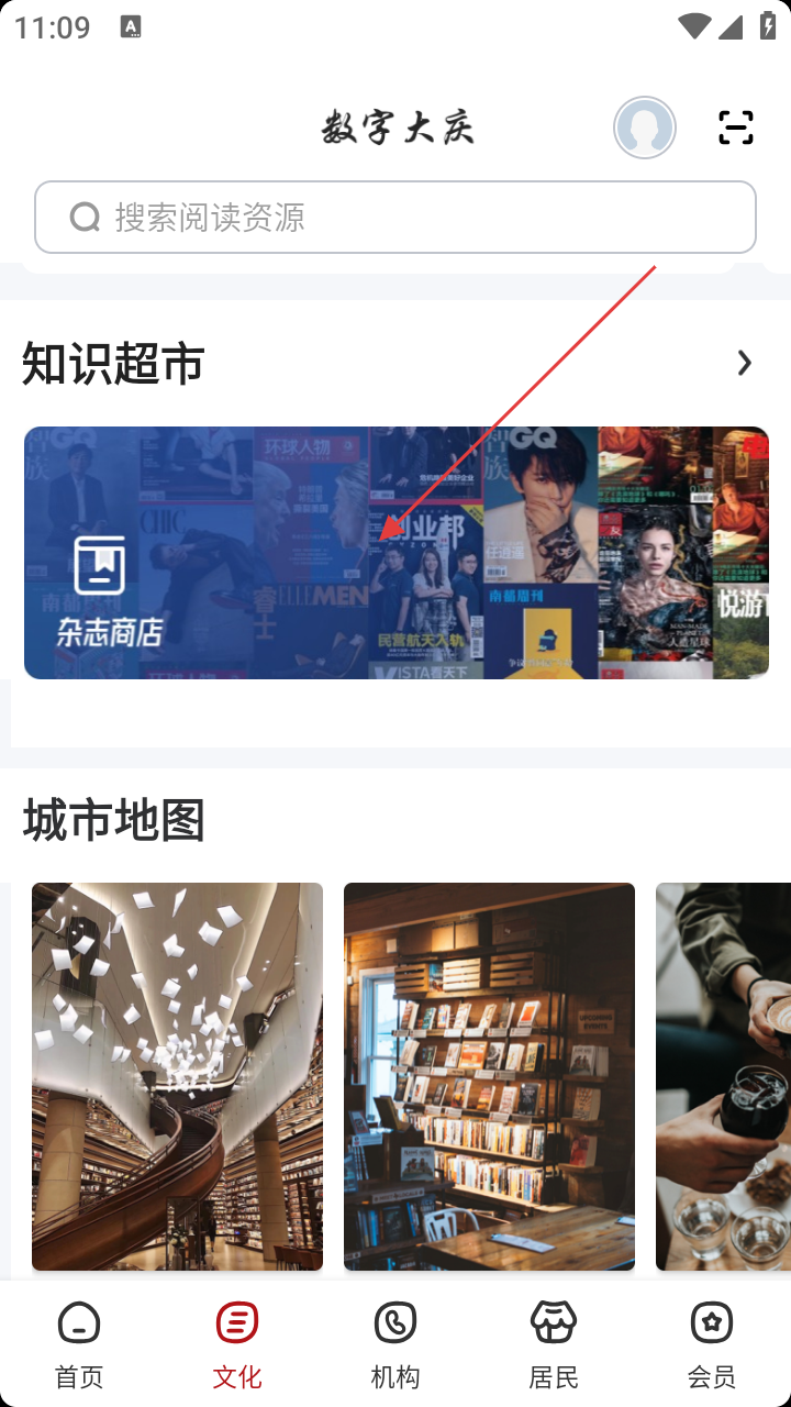 2、在文化页【知识超市】,选【杂志商店】,浏览杂志资源。