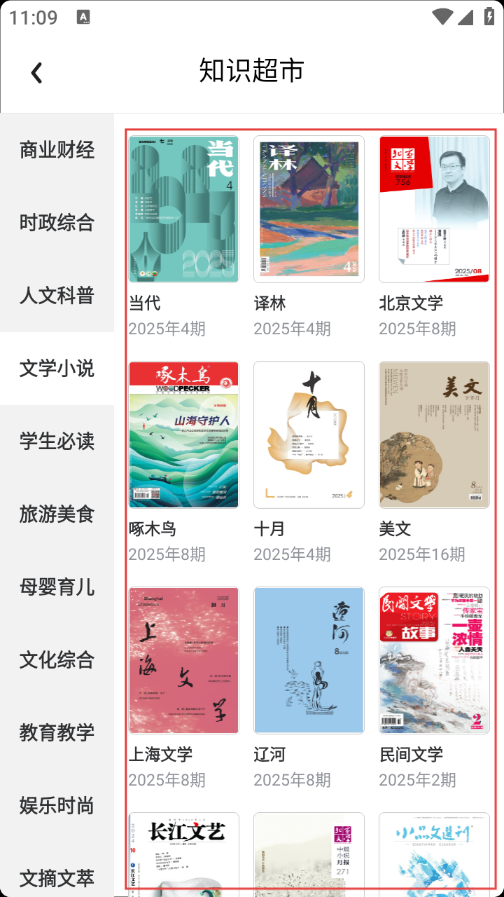 3、知识超市左侧选【文学小说】分类,筛选文学类杂志。