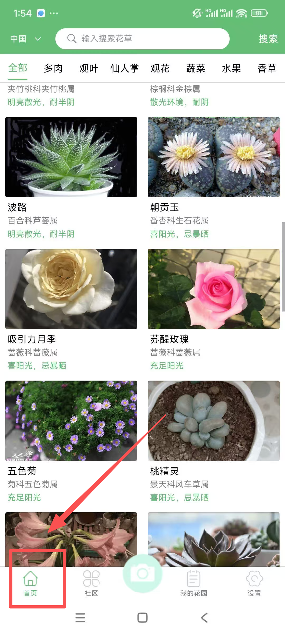 2、在首页,点击底部导航栏中的“首页”图标,浏览各种植物。