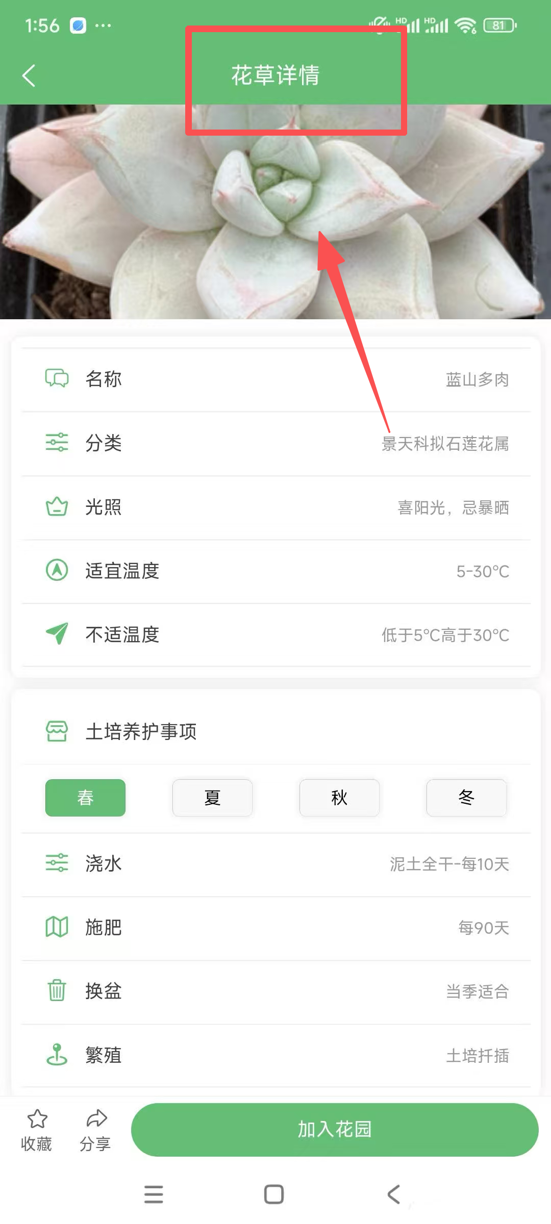 3、在植物详情页,点击页面顶部的“花草详情”以查看详细信息。