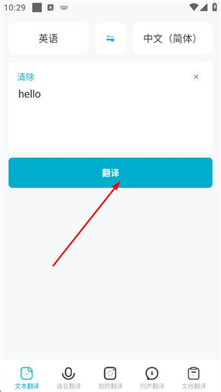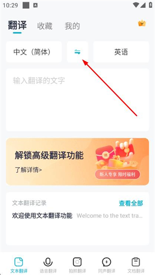 1、在翻译页面点击语言切换按钮,调整翻译的源语言与目标语言。