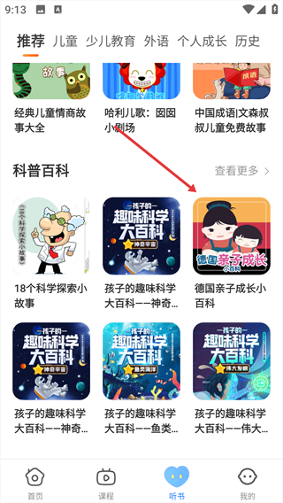 3、于【听书】专区,能畅听各类有声读物,包含睡前故事、名著解析、历史趣谈等。