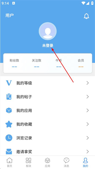 2、在个人页面,点击未登录区域,进入登录页面。