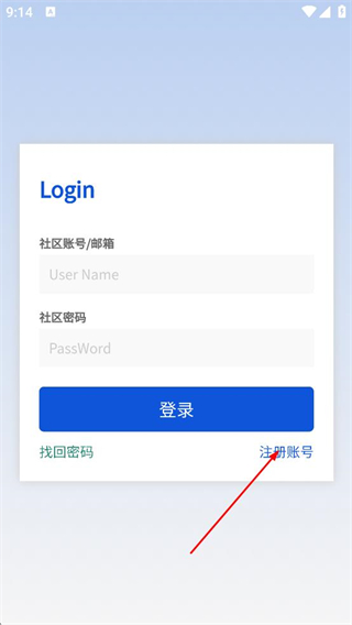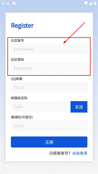4、在注册页面,依次填写社区账号与社区密码这两项信息。