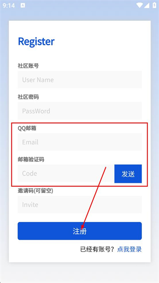 5、接着填写QQ邮箱与邮箱验证码,点击注册按钮,即可完成账号注册流程。