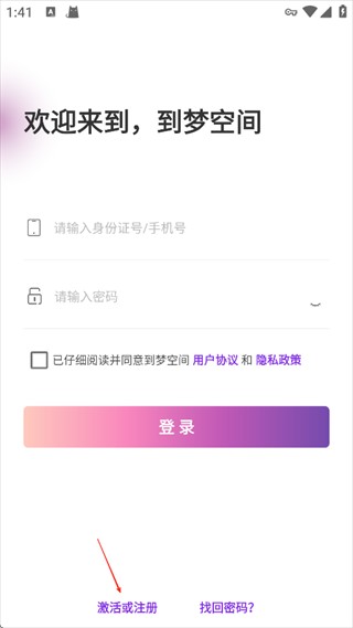 1、打开到梦空间App点击激活或注册