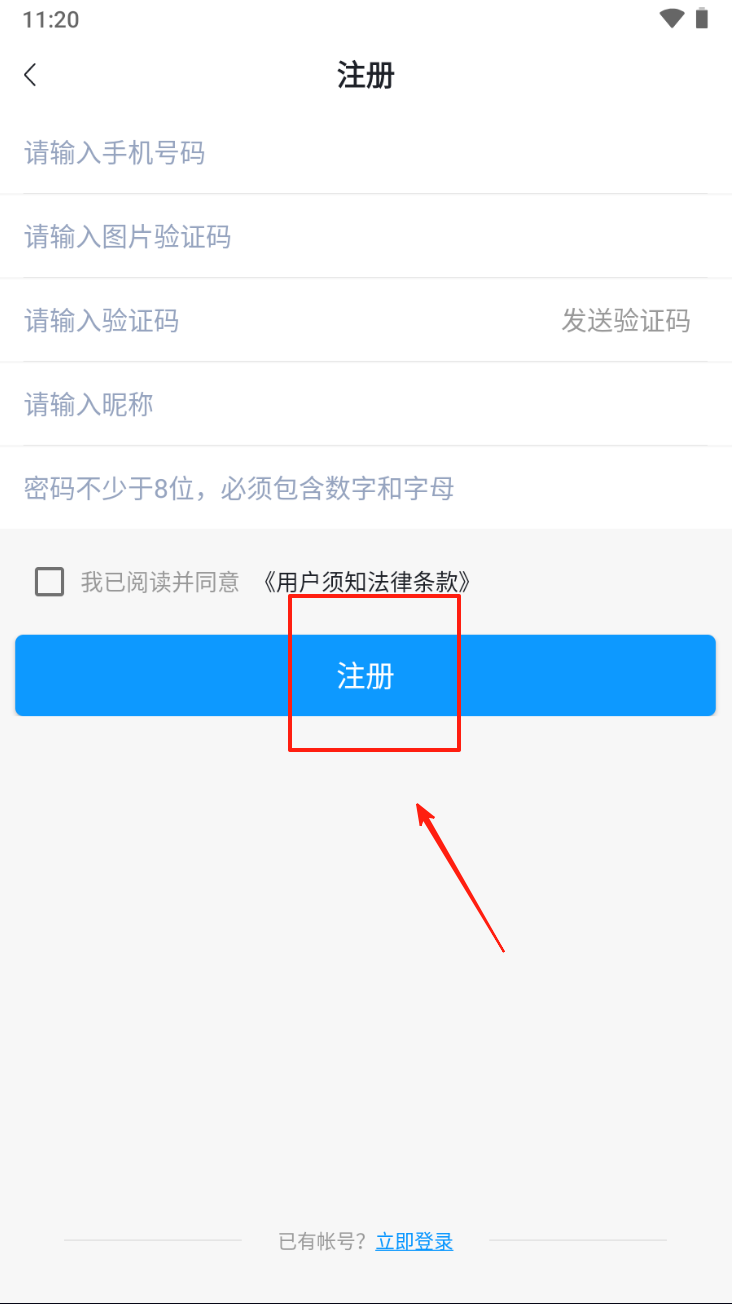 3、在注册页面输入必要信息,勾选同意条款,点击“注册”按钮完成注册。
