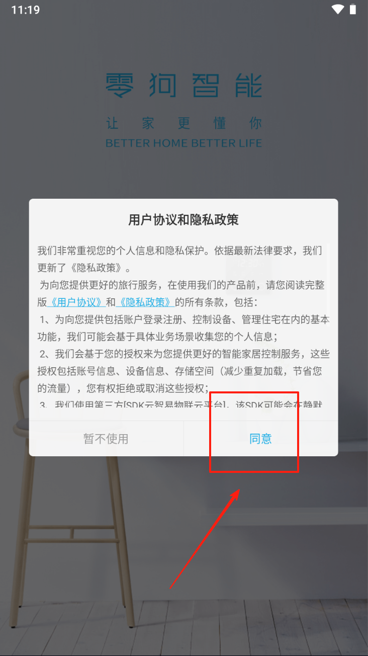 1、阅读并同意《用户协议和隐私政策》,点击“同意”按钮继续。