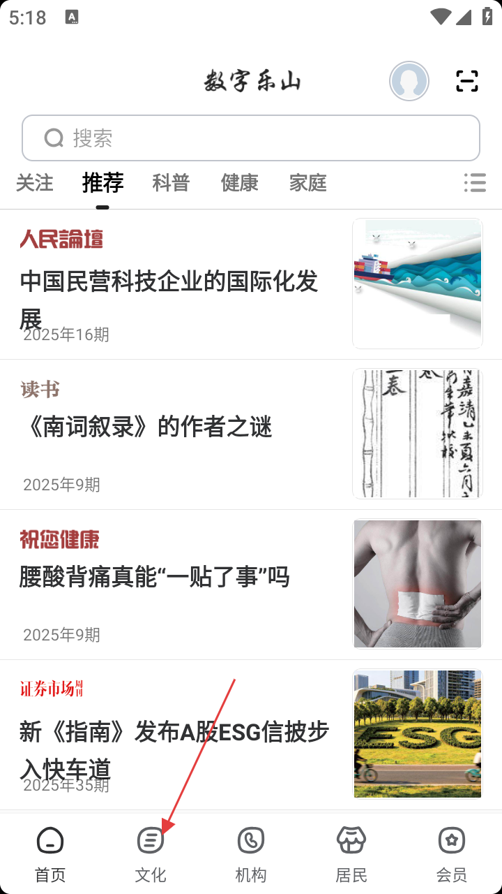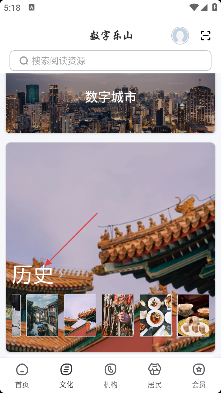 1、打开“数字乐山”平台,在首页底部导航栏中找到并点击【文化】选项,进入文化内容展示页面。