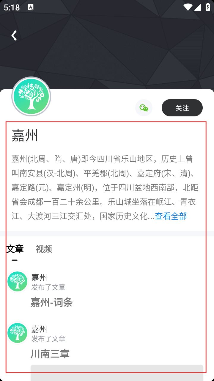 4、点击【嘉州】条目,即可查看嘉州的详细介绍,包括历史沿革、地理位置等信息,还能浏览《嘉州-词条》《川南三章》等相关文章。