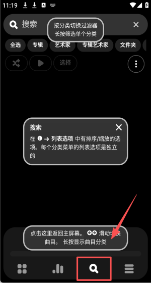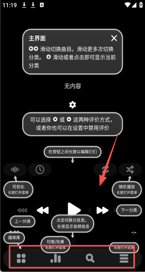 1、这里是poweramp的主界面,你可以在这里完成滑动切换曲目、滑动更多次切换分类等操作,你还可以通过滑动或者点击来显示当前分类。