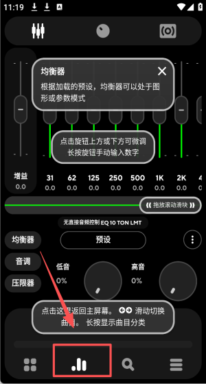 3、在均衡器页面,你可以点击旋钮上方或下方进行微调,根据自己的喜好可以设置为多种不同风格。