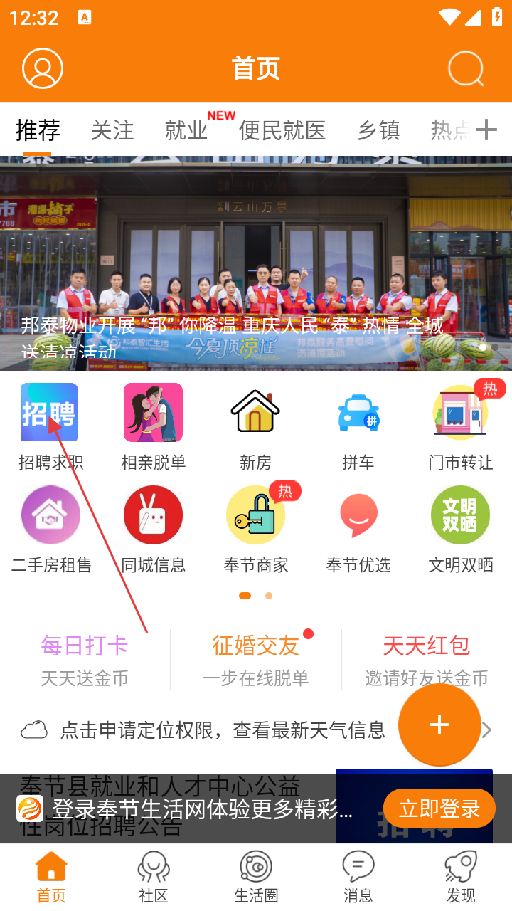 1、进入首页,点击【招聘求职】,进入奉节生活网人才板块找工作。
