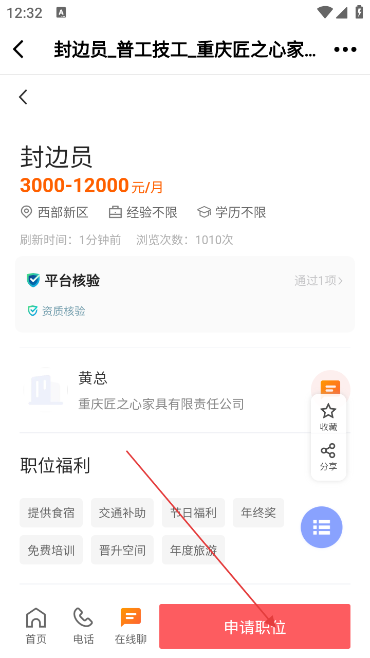 4、进入详情界面,查看岗位具体情况,点【申请职位】,提交求职申请。