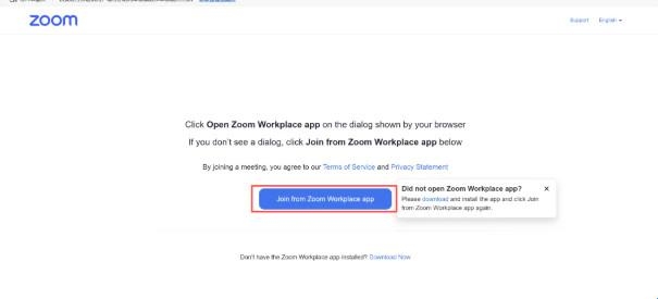 2、先点击蓝色的【从Zoom Workplace应用加入启动会议】按钮,在弹出的对话框中点击【打开Zoom】按钮,启动已经安装完成的客户端。