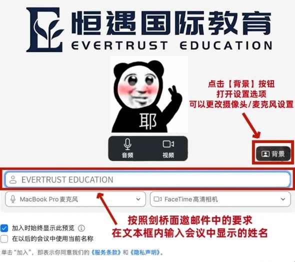 3、在弹出的Zoom软件界面中,根据剑桥面邀邮件中的要求,输入参加会议时显示的姓名,然后点击【加入会议】按钮。