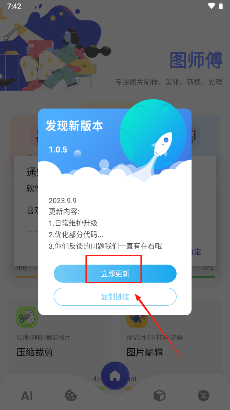 1、当提示发现新版本时,点击“立即更新”按钮进行应用更新。