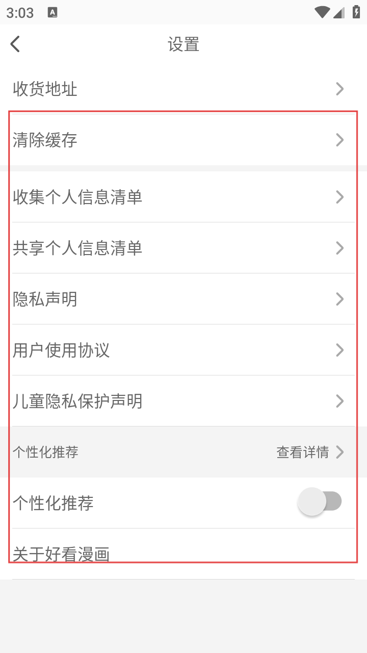 3、在设置界面,可关闭【个性化推荐】功能,还能查看【收货地址】【清除缓存】等选项及隐私相关声明。