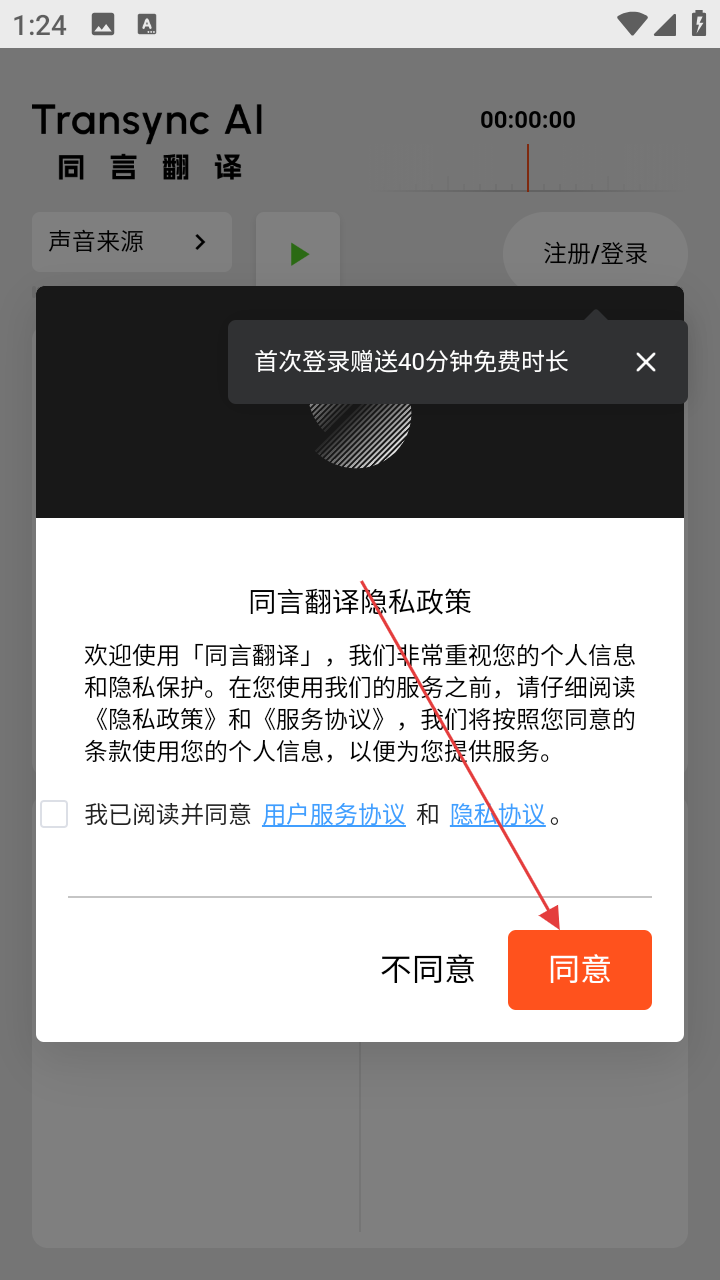 1、使用同言翻译,先勾选同意隐私政策,点【同意】进入主界面。