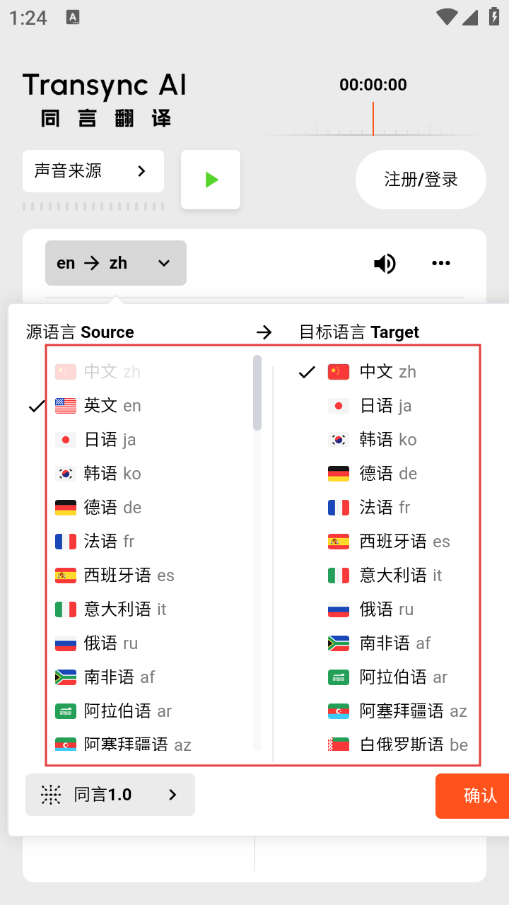 3、按需选源语言和目标语言,丰富语种如【英文-en】转【中文-zh】等。