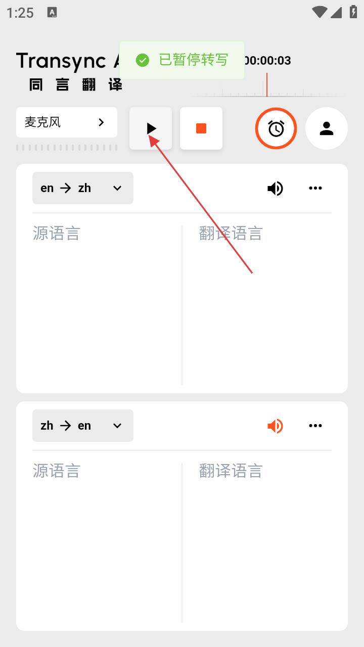 4、开始翻译后,可点暂停按钮,控制转写状态,灵活使用功能。