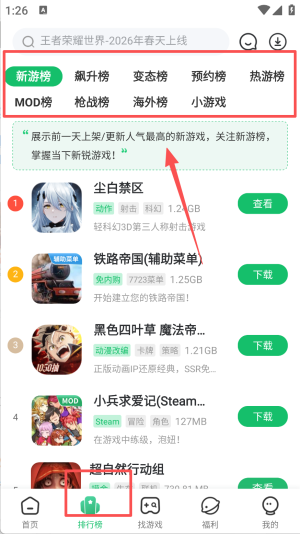 3、进入排行榜板块,可查看新游榜、飙升榜等多个游戏榜单,掌握当下游戏热度,挑选感兴趣的游戏。