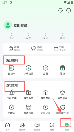 1、进入七七二三游戏盒子 “我的” 板块,可进行立即登录,查看游戏福利与游戏管理功能,如省钱卡、游戏存档等。