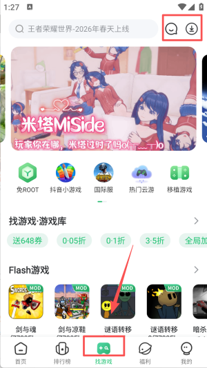 2、在找游戏板块,可搜索游戏,浏览免 ROOT、抖音小游戏等各类游戏推荐,便捷查找心仪游戏。