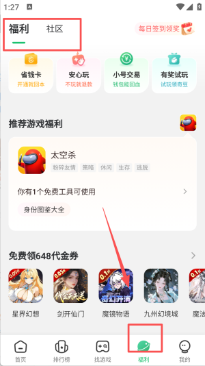 4、在福利板块,可参与每日签到领奖励,查看省钱卡、有奖试玩等福利,领取推荐游戏福利与代金券。