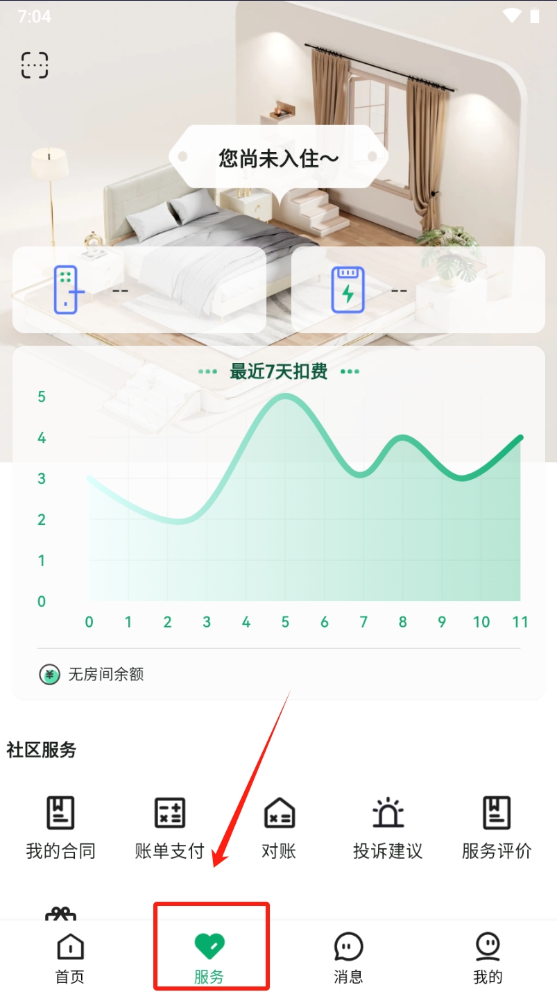 2、查看服务:点击底部“服务”按钮,了解社区服务和账单支付。