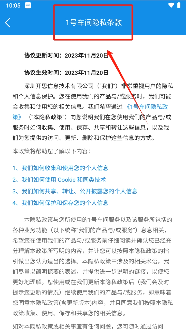 3、最后,阅读隐私条款。在隐私条款页面,了解1号车间如何收集和使用您的个人信息,并在同意条款后继续使用软件。