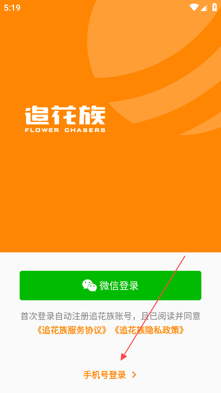 1、打开追花族,弹出用户协议及隐私政策,点【同意】。