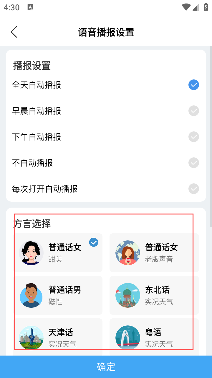 4、在语音播报设置页,选播报设置和方言,点【确定】生效。