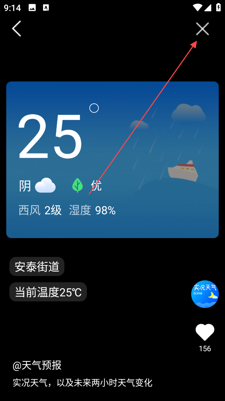 3、进入天气页,查看实时天气,点右上角【×】关闭。