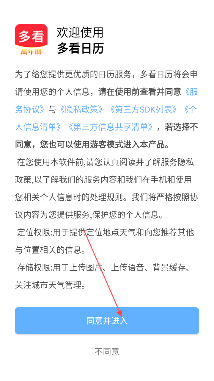 1、首次使用多看日历,阅读相关协议后点【同意并进入】,进入日历主界面。