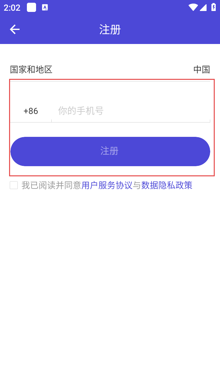 4、进入注册页面,选择国家和地区,输入手机号码,然后点击【注册】按钮,完成注册操作。