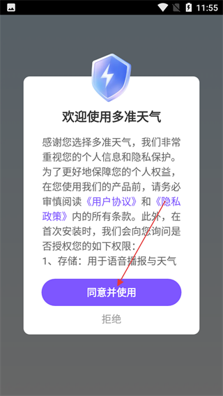 1、首次打开App,阅读《用户协议》《隐私政策》后,点击“同意并使用”,进入天气主界面。