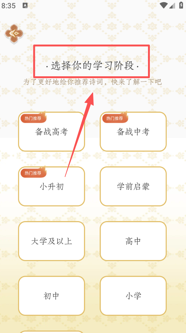 2、进入学习阶段选择页面,根据自身情况挑选对应的学习阶段,以便获取合适的诗词推荐。