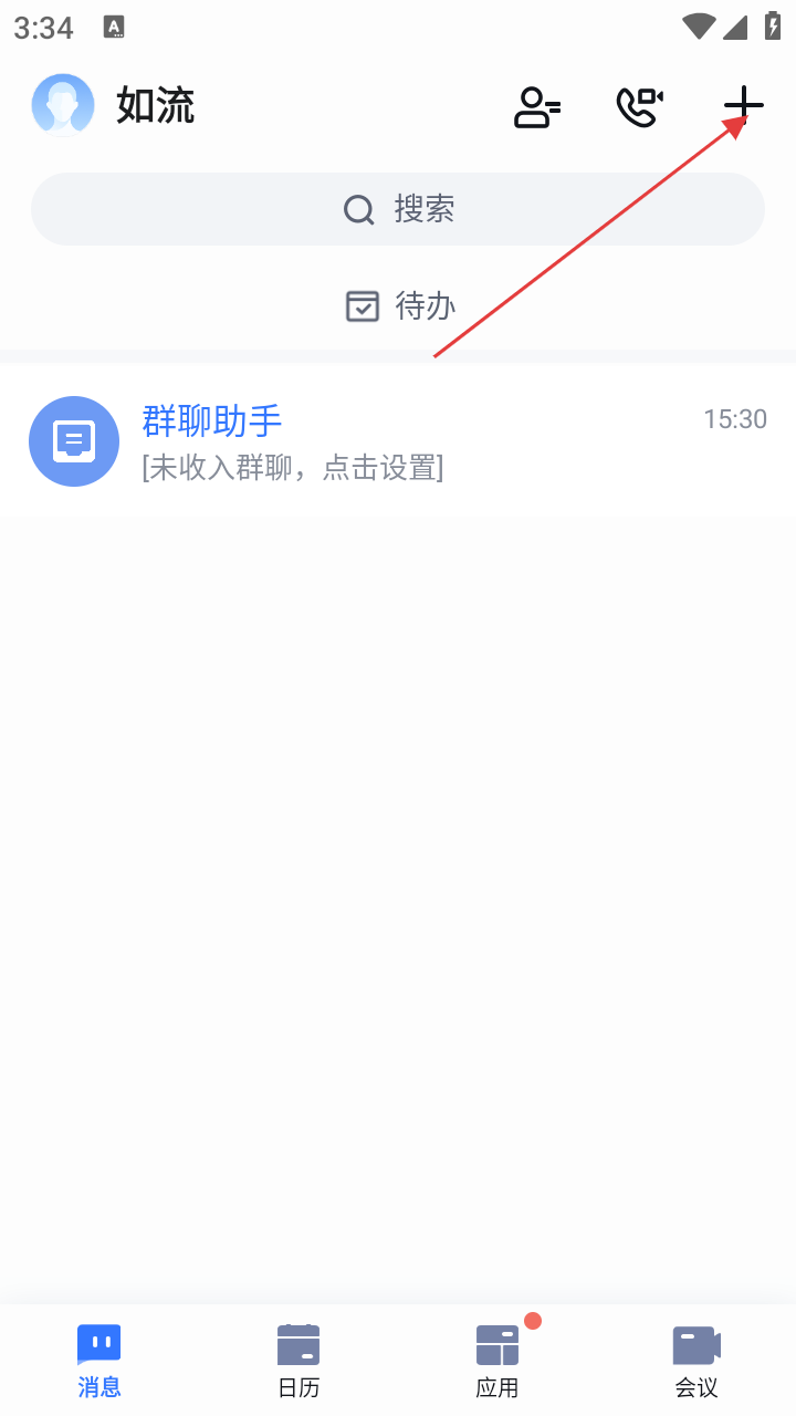1、在如流APP消息页面,可查看群聊助手等消息,点击右上角“+”号进入功能选择界面。