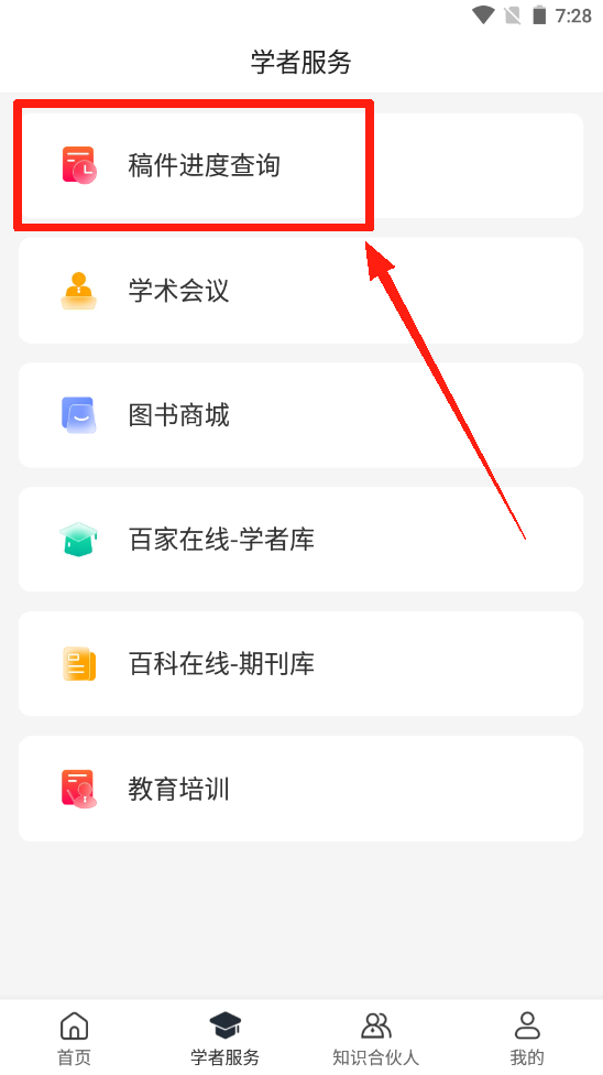 3、查询稿件进度。在学者服务页面中点击“稿件进度查询”查看稿件状态。