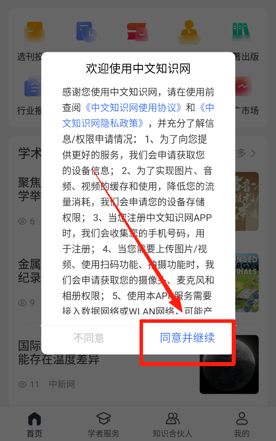 1、同意使用协议。点击“同意并继续”按钮以接受使用协议和隐私政策。